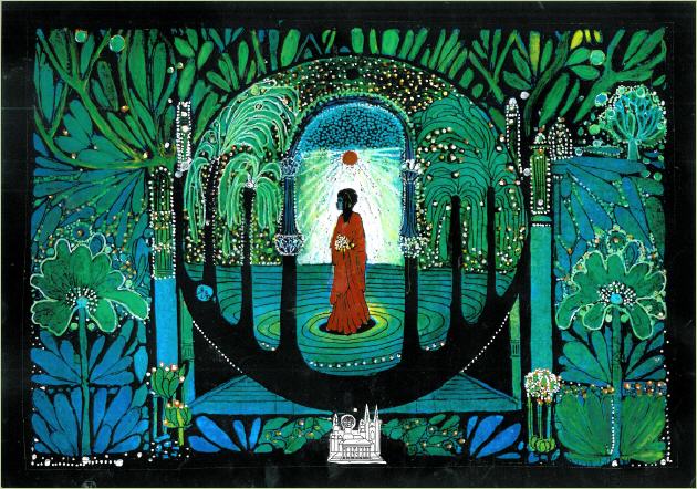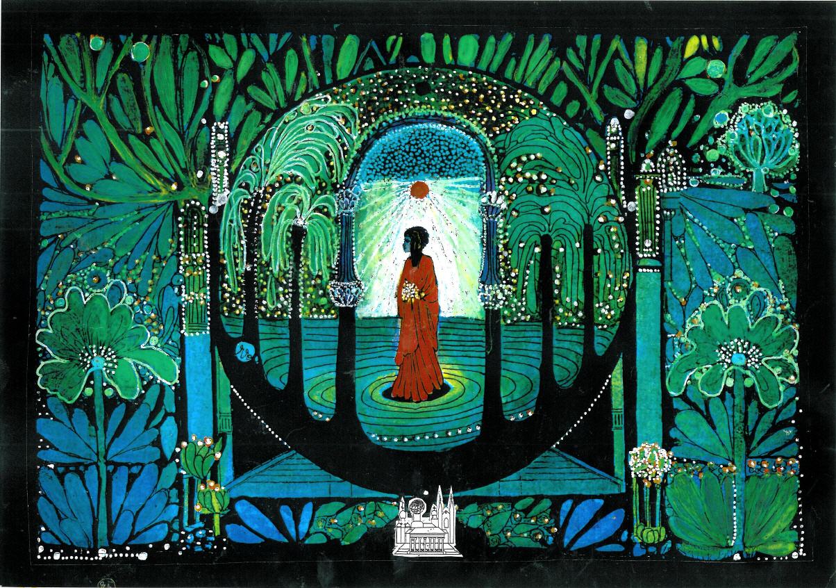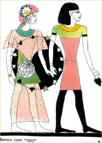 grafische Darstellung. Die Vergangenheit schreitet mit der Gegenwart in die Zukunft. Die junge Europa, die "Fruchtbare" umkränzt von den Europasternen, trägt das Schicksal der Welt.